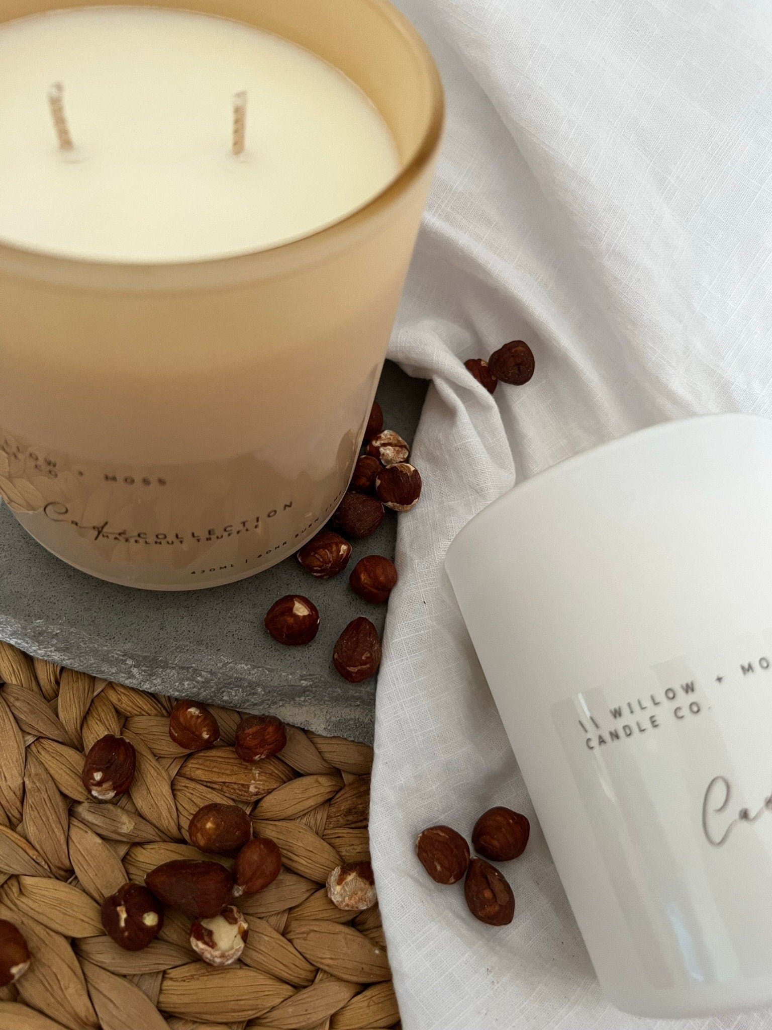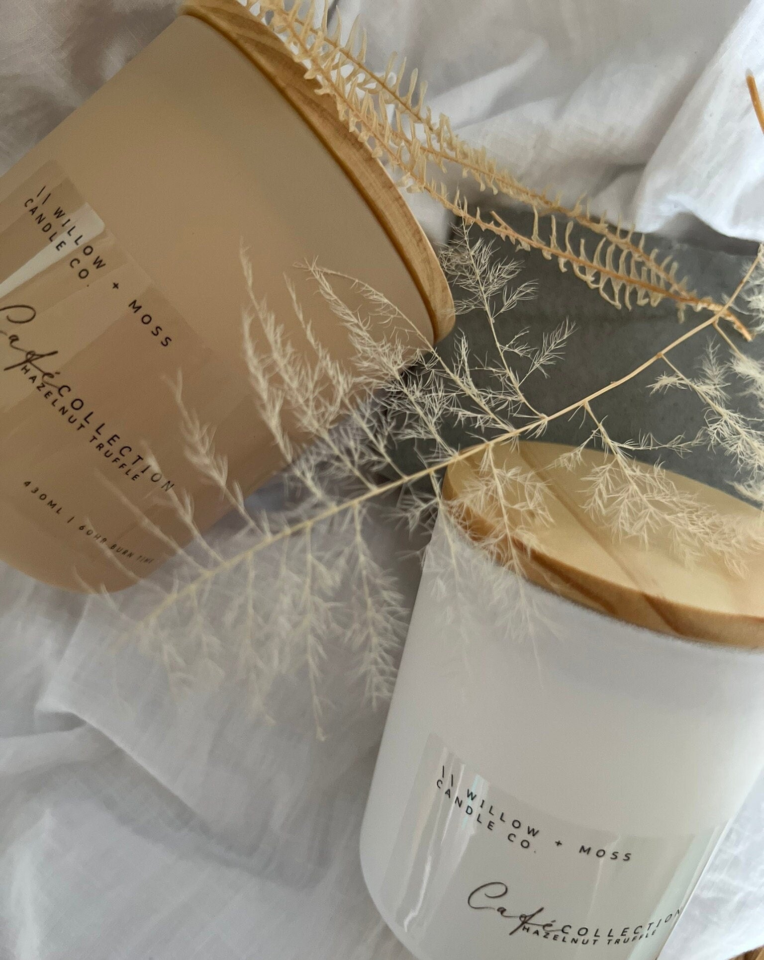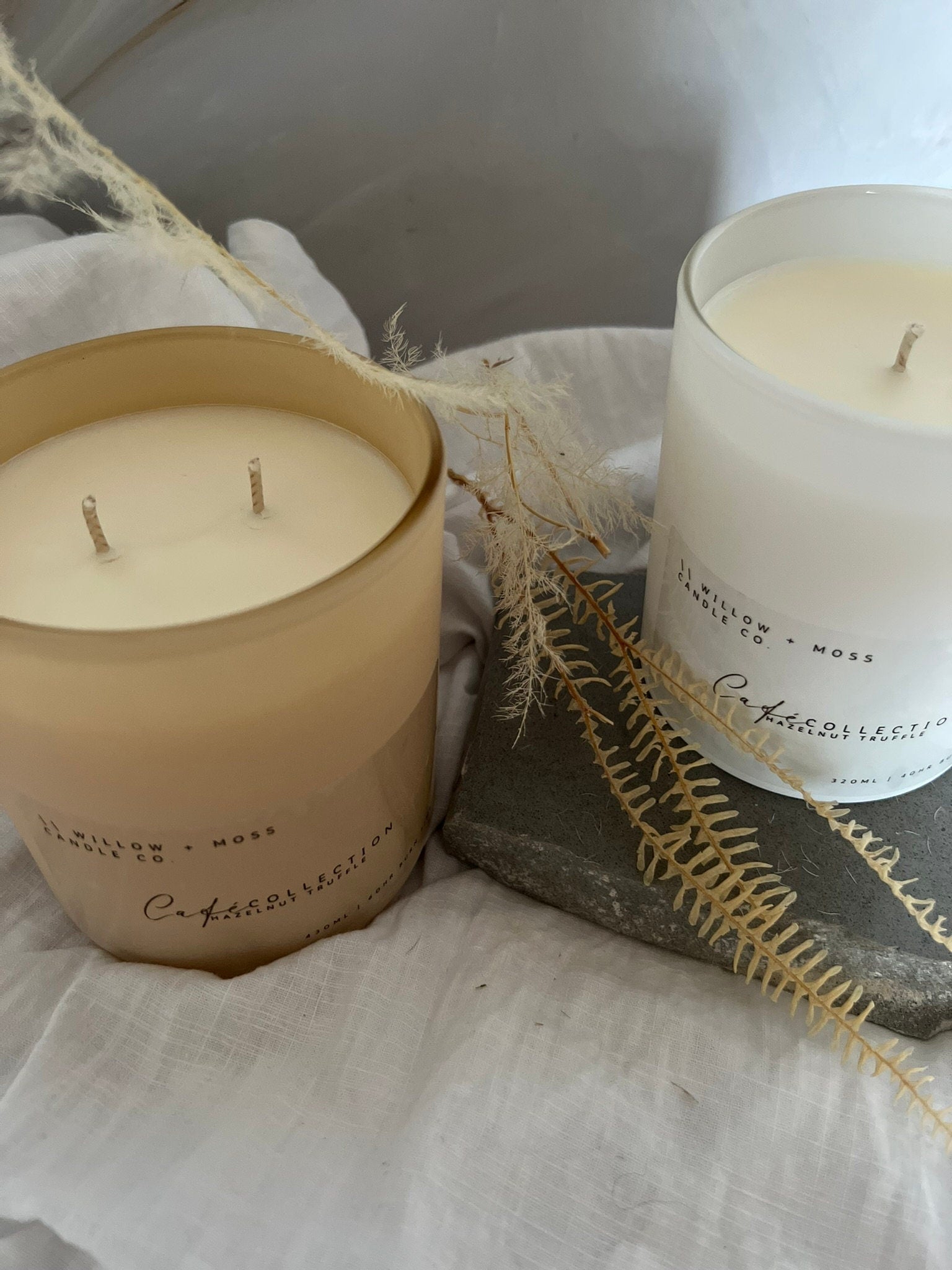 Two candle options: 320g single-wick candle (white vessel) and 430g double-wick candle (beige vessel)