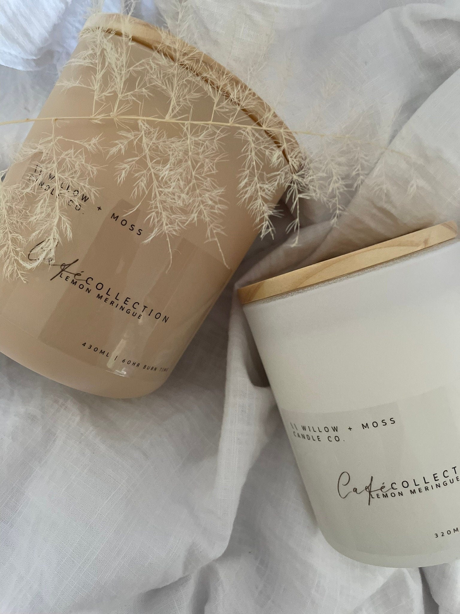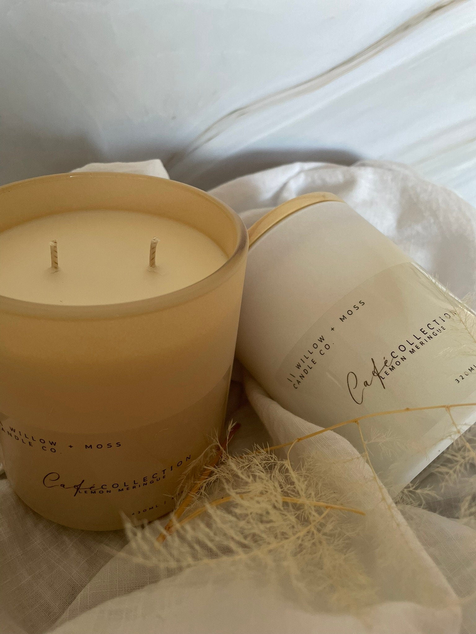 Two candle options: 320g single-wick candle (white vessel) and 430g double-wick candle (beige vessel)